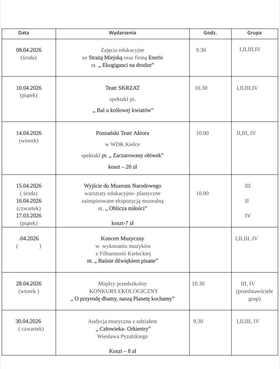 Harmonogram imprez - Kwiecień